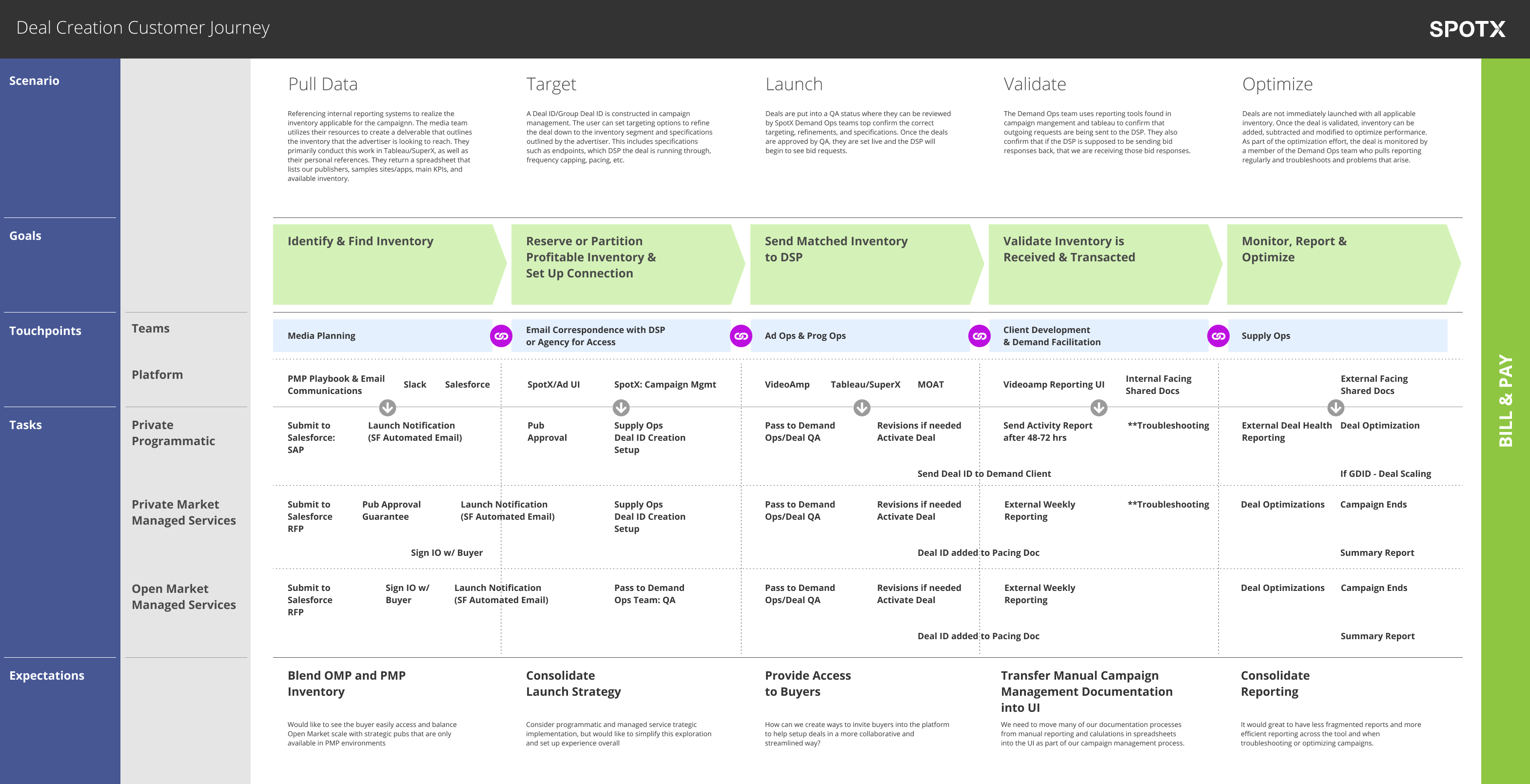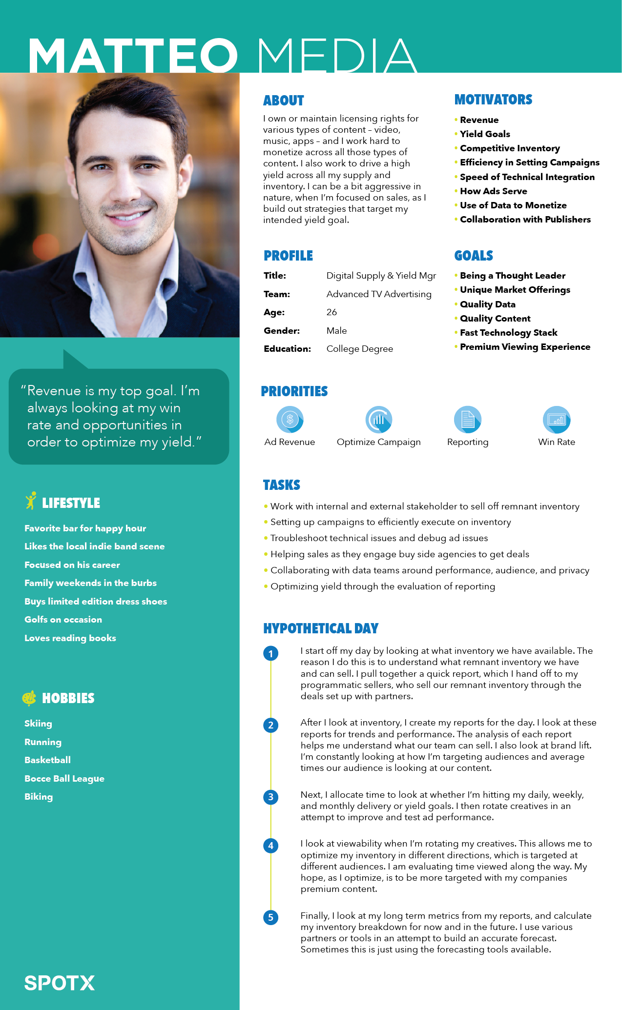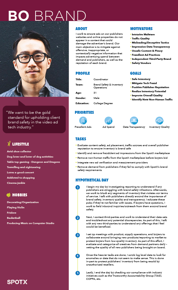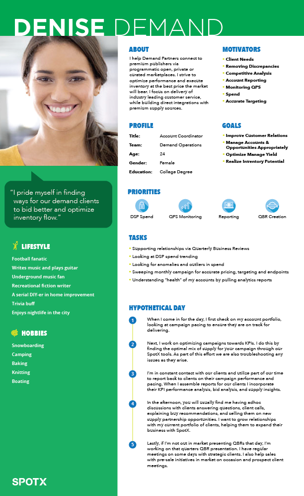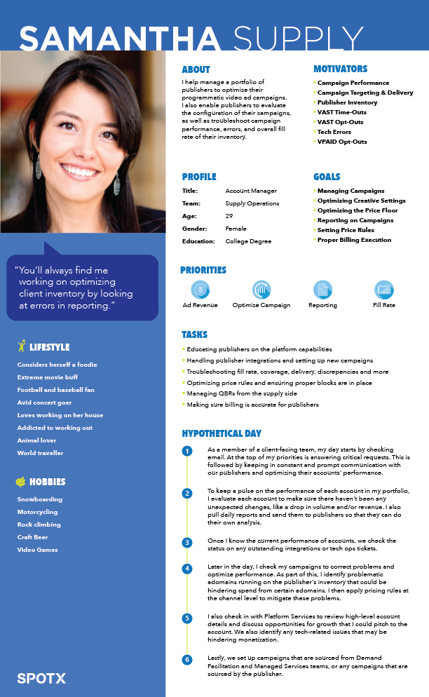 Continuing to enact on my design strategy for the company, I conducted 32 interviews with media owners, brand specialists, demand partners, and supply partners, in order to create a series of personas that would help guide feature creation. These personas enabled us to target the right type of user and their needs in the product.